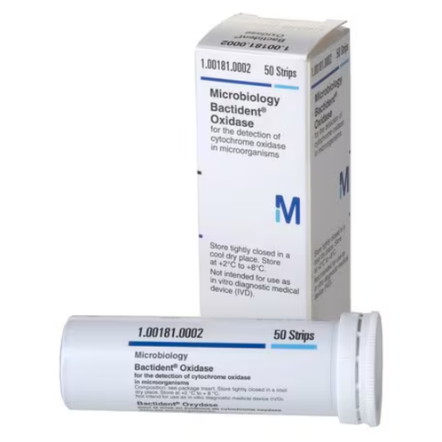 Las Tiras Reactivas Oxidasa Bactident™ (1.00181) están diseñadas para la detección rápida de microorganismos positivos a citocromo oxidasa en cultivos microbiológicos.